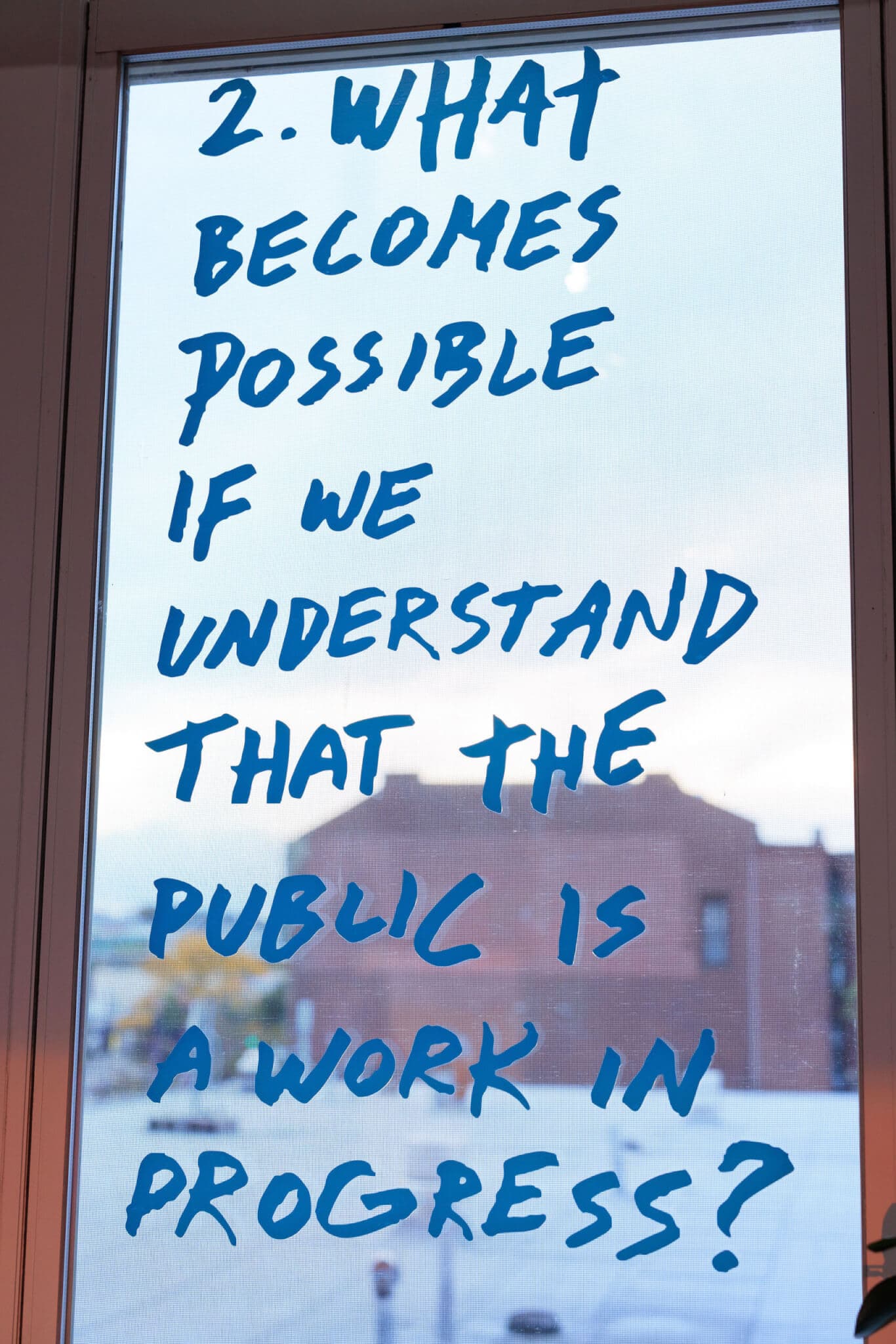 LL: I don’t know if the questions shape the event, but they weave in and out of the event. The questions themselves are an intervention. We try to actually put them up around the city as an intervention, as a provocation, as a way to invite people into some of the questions, like “What is a citizen forbidden from feeling?” or “What is hidden in public?” or “How do we reimagine imagination?” They are questions that we wanted to share in public space with passersby. So folks might look for the questions or they just might stumble upon a question. And then there are questions that we were really using to highlight some of our work, like “Have you framed the problem large enough to include yourself?” which was really part of how we were thinking about our Social Emergency Response Center. But there are a lot of ways that we let the questions weave throughout the space. Like there are questions on the windows that you might look out and see—like “What’s happened to us spatially?”—while you’re looking out at the city. So they’re not really like the format per se; they operate sort of as a subtext.