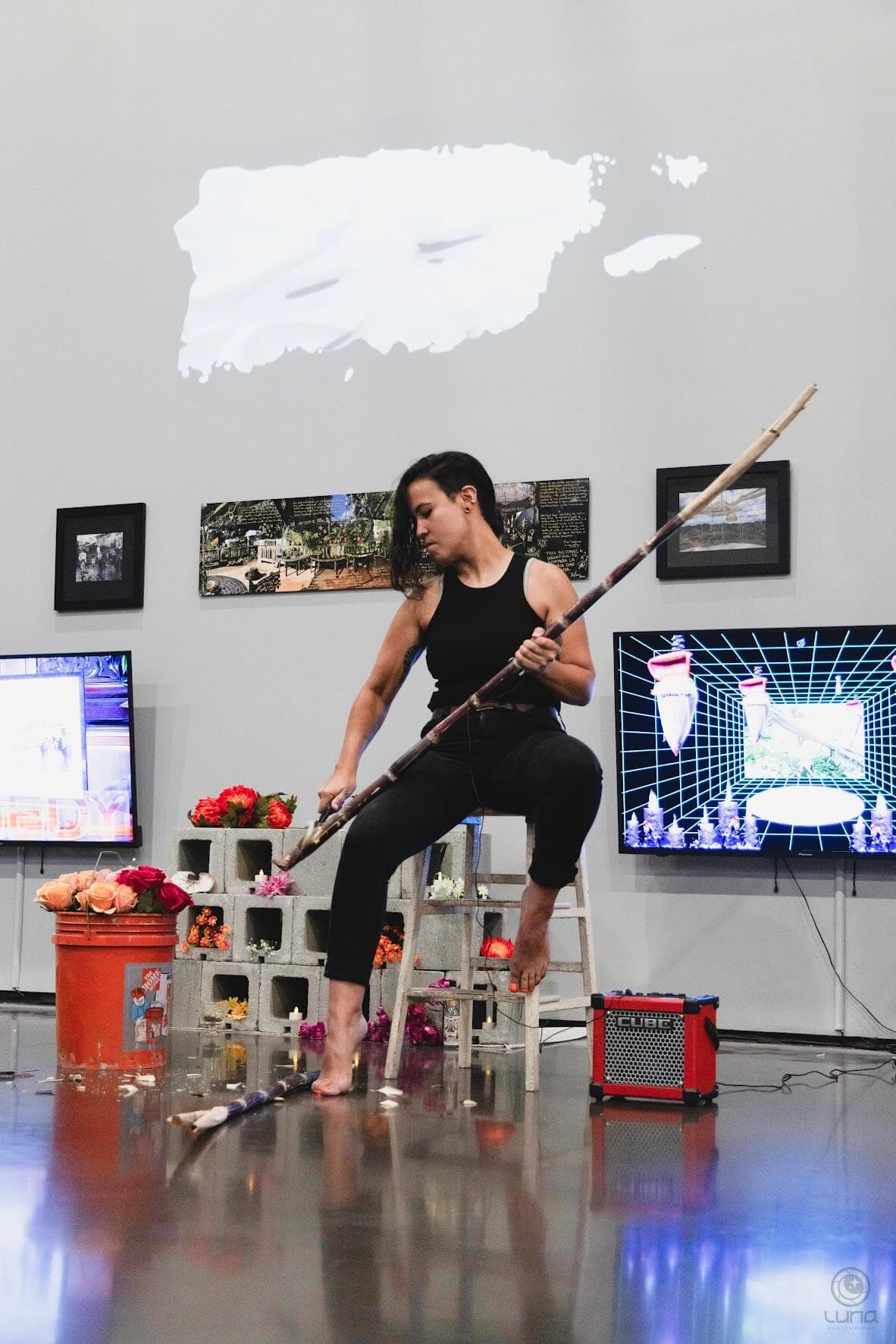 Shey ‘Rí Acu’ Rivera Ríos during a performance at Providence Biennial, 2023 Photo by Jenny Luna Watson. Courtesy of the artist.